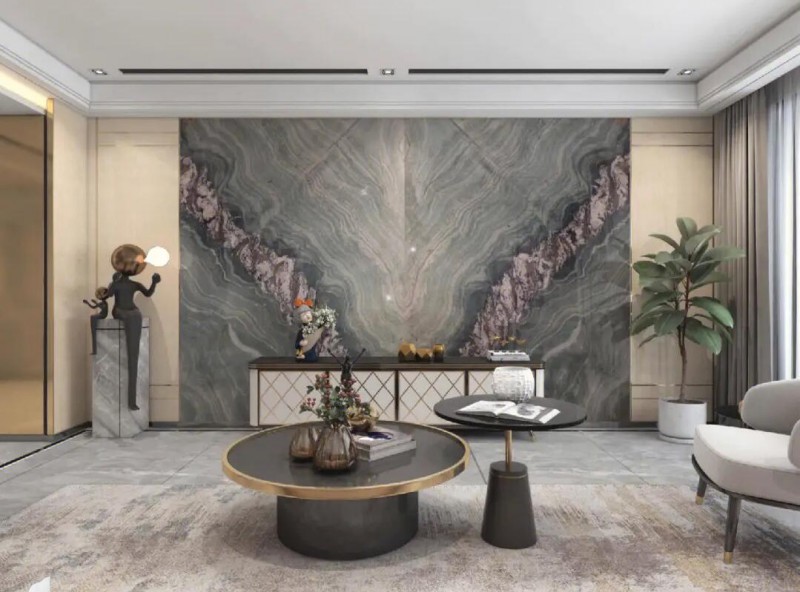 奢石在室内设计中被广泛运用在背景墙、台面、桌几等。由于奢石价格昂贵,大部分都是局部小范围使用,起到画龙点睛的作用。