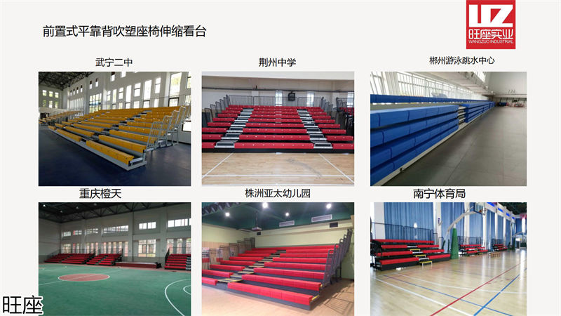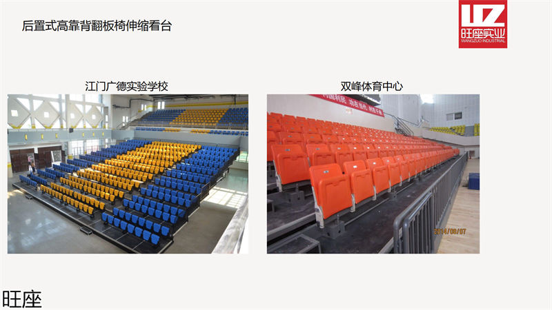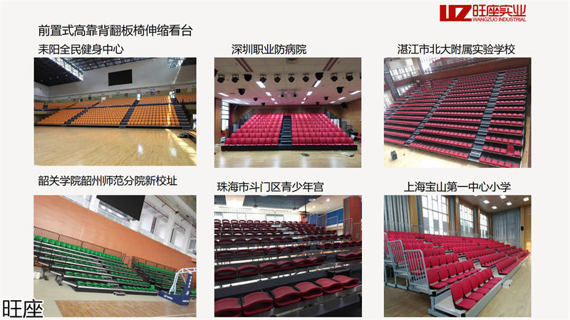 伸缩看台椅,体育场馆看台座椅,电动、手动、前置、后置、可移动式、伸缩翻板看台椅,活动看台椅工程定制,广东旺座伸缩看台椅生产厂家