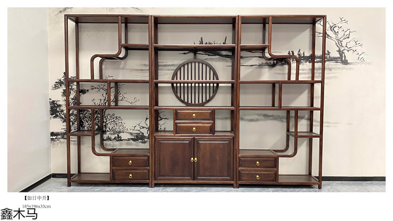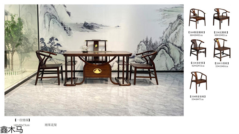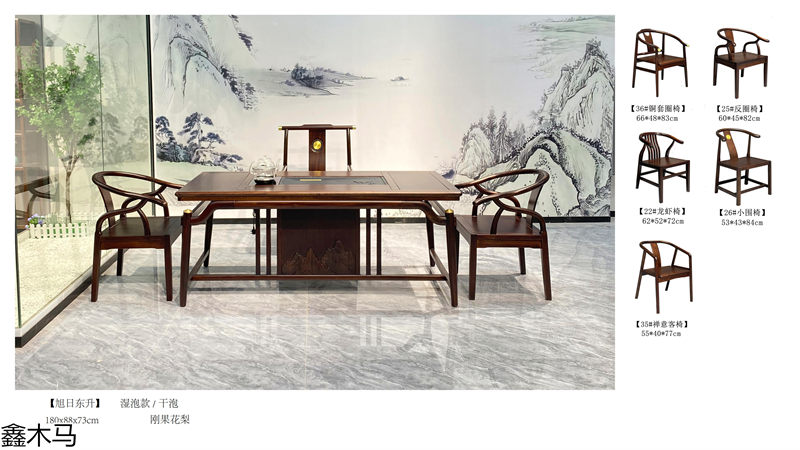 新中式风格茶台,南康实木茶桌、办公桌,新中式茶空间、办公家具,江西刚果花梨木、乌金木、格木茶台、茶椅、博古架,鑫木马家具生产厂家