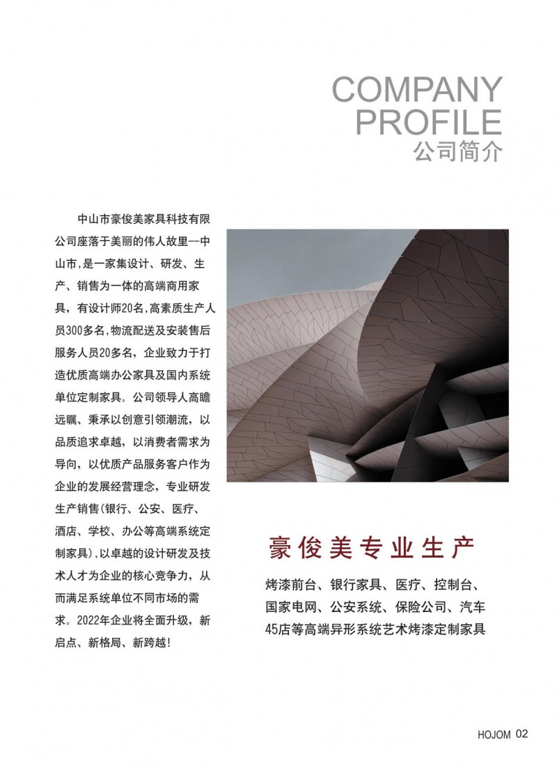 中山市豪俊美家具科技有限公司座落于美丽的——中山市,是一家集设计、研发、生产、销售为一体的高端商用家具,有设计师20名,高素质生产人员300多名,物流配送及安装售后服务人员20多名,企业致力于打造优质高端办公家具及国内系统单位定制家具。公司领导人高瞻远瞩、秉承以创意引领潮流,以品质追求卓越,以消费者需求为导向,以优质产品服务客户作为企业的发展经营理念,专业研发生产销售(银行、公安、医疗、酒店、学校、办公等高端系统定制家具),以卓越的设计研发及技术人才为企业的核心竞争力,从而满足系统单位不同市场的需求。2022年企业将全面升级,新启点、新格局、新跨越!