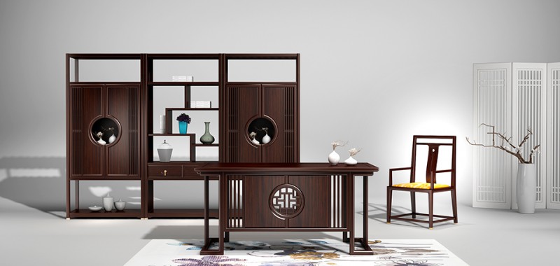 卫府里新中式乌金木SZ602书桌、WZY626主椅、BGJ626博古架