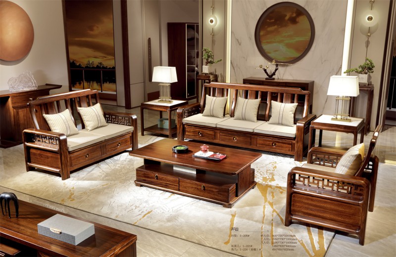 昌龙禾运新中式乌金木沙发1-205#、长茶几1-221#、角几1-226(岩板)#